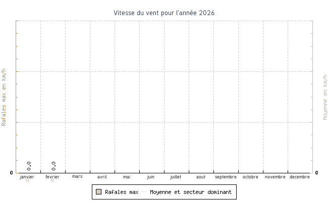 | janvier | -3.3 °C | 4.0 °C | 13.4 °C | 8.5 °C | 6.2 °C | 0.0 km/h | 0.0 km/h | N |
