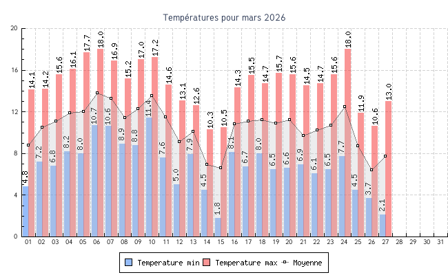 | 14 | 4.5 °C | 10.3 °C | 6.9 °C | 0.0 km/h (0.0 km/h) | N |